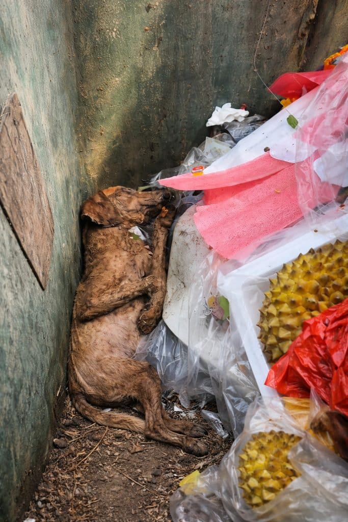 Inside a large garbage container, hidden beneath scraps and waste, a small body lay almost lifeless.