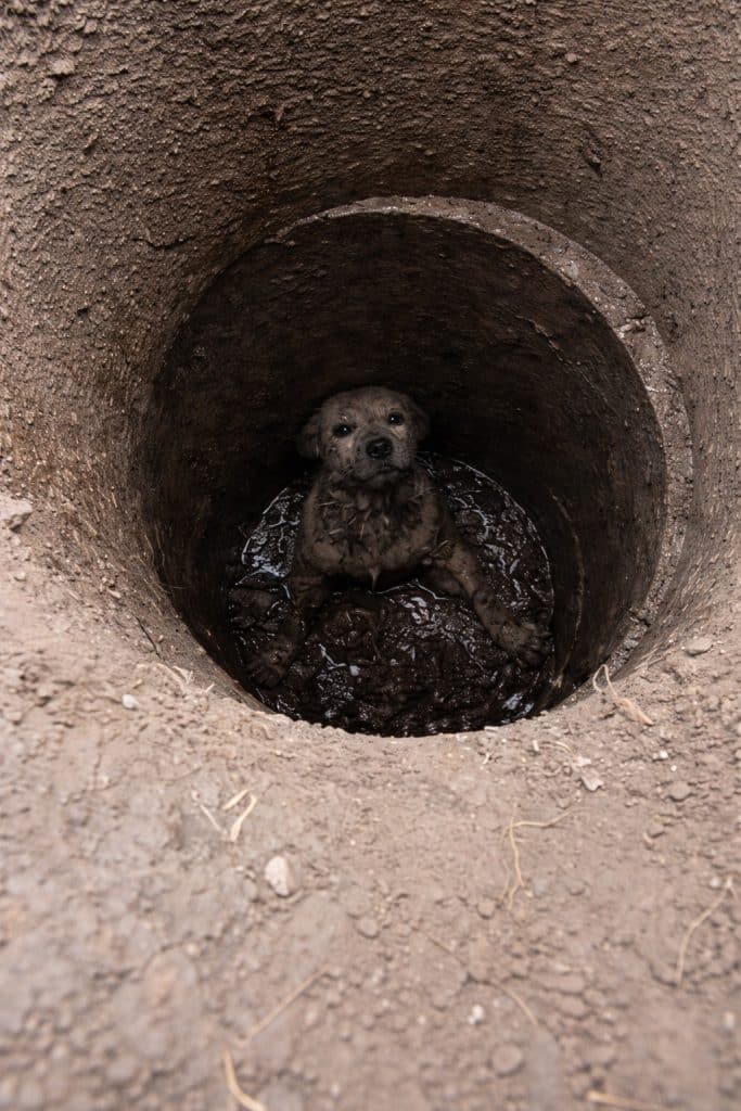 At the bottom of a deep, narrow well, a small dog lay trapped—surrounded by cold, damp earth, his body covered in mud, his strength nearly gone.