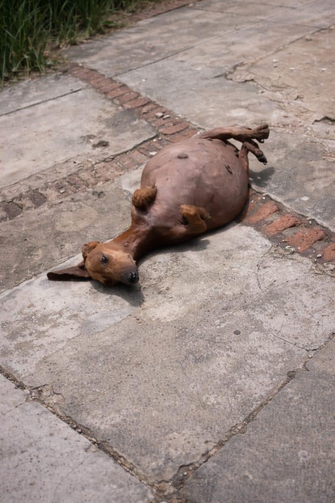 On an ordinary street, where people passed without noticing, a small dog lay completely still.