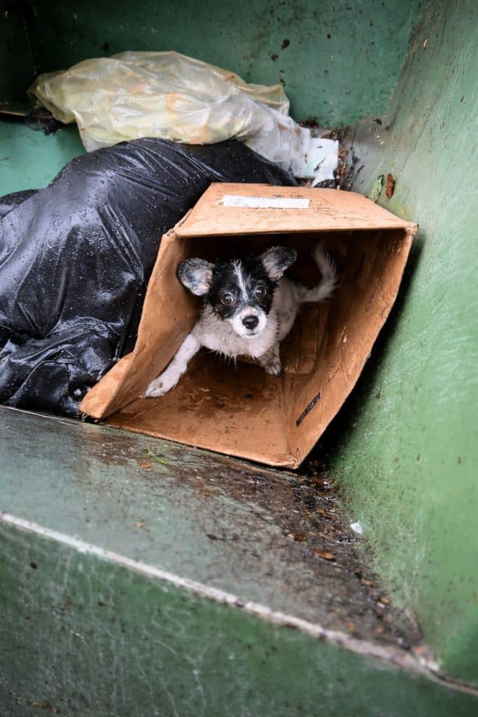 Inside a trash bin, soaked and trembling, was a tiny puppy—too weak to move, too small to understand what had happened to him.