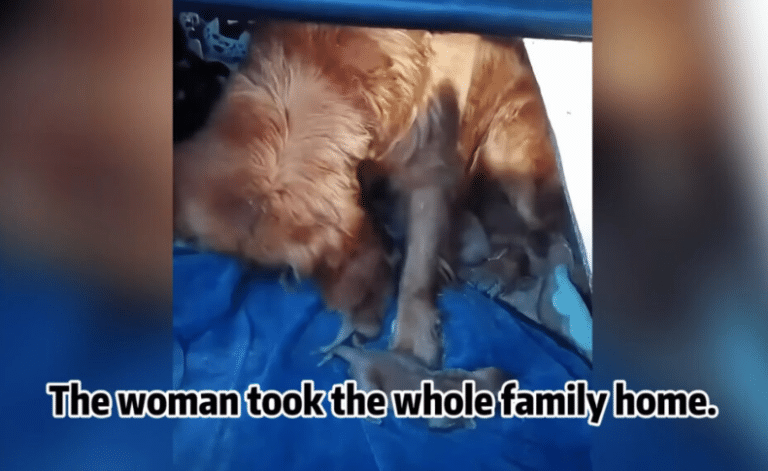 Curled tightly around her newborn puppies, she used the little strength she had left to shield them from the damp ground and biting air. The puppies were only hours old—blind, fragile, and completely dependent on her. Their tiny whimpers blended with the faint metallic sound of the chain each time their mother tried to adjust her position. She licked them gently, driven by instinct and devotion, even as exhaustion pressed heavily on her body.