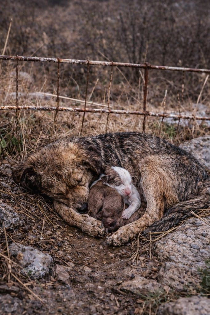 Her body was weak, one leg injured, yet she curled tightly around her newborn puppies, trying to shield them from the bitter cold. Four tiny lives pressed against her, depending on the little warmth she could still give.