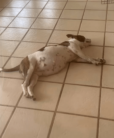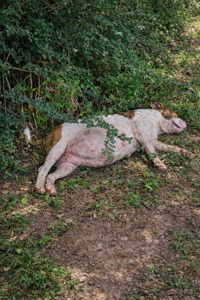 At first glance, it looked like simple exhaustion. A stray dog too weak to continue, her body still, her energy completely drained.