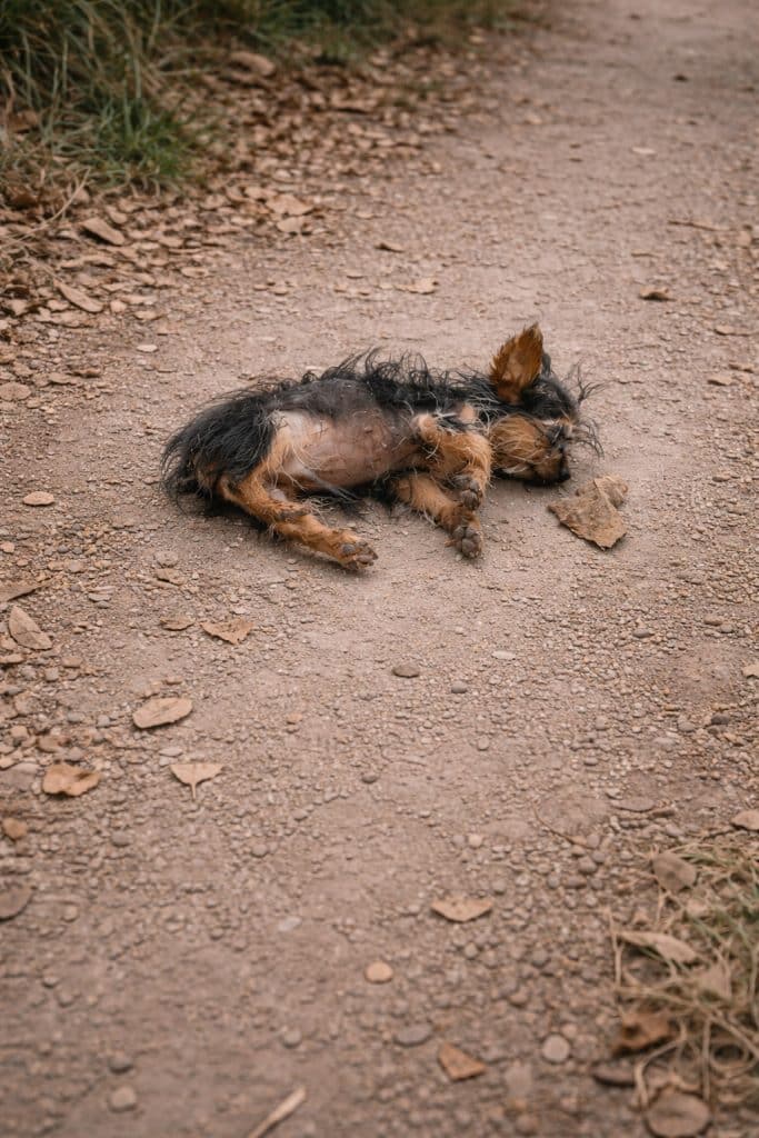 A tiny Yorkshire Terrier lay motionless on the sidewalk. His body was stiff, his breathing so faint it was barely noticeable.