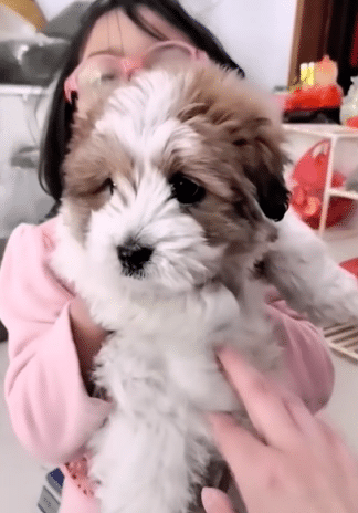 When the door opened, the mother stepped inside and carefully placed her puppy down.