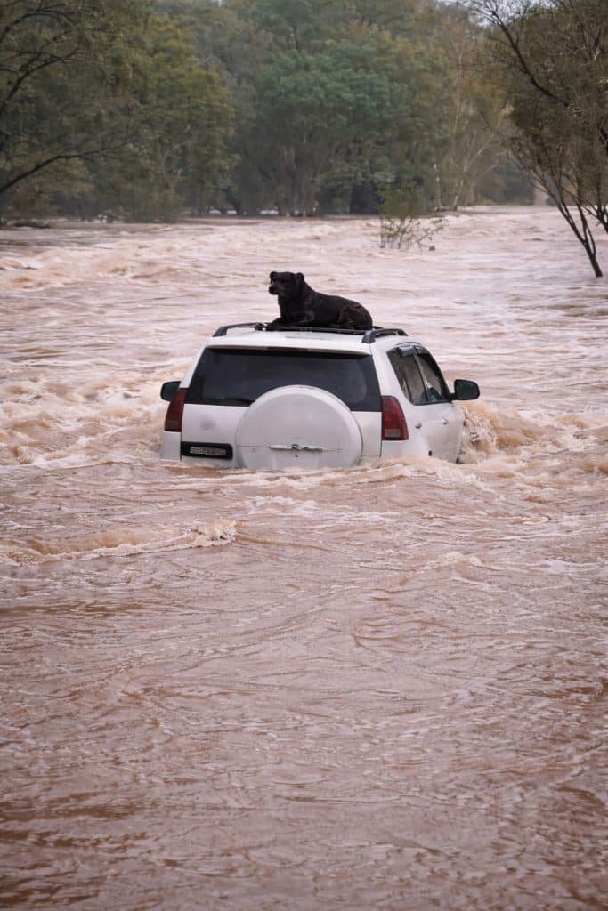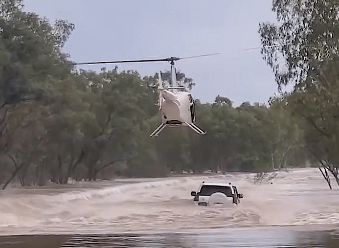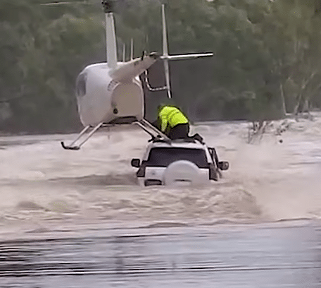 In the middle of the current, a white SUV sat half-submerged—trapped, unstable, and surrounded by rushing water that showed no sign of slowing down.