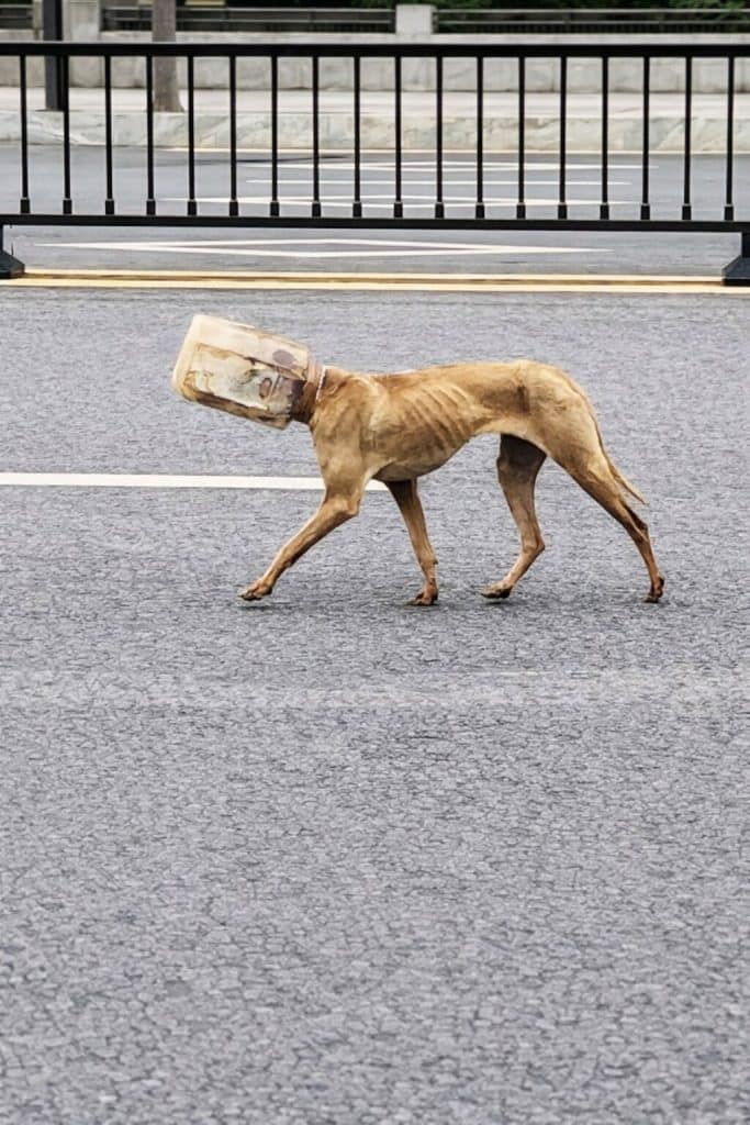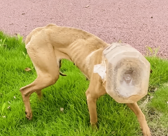 But what made his condition even more alarming was something no animal should ever endure — his head was completely trapped inside a large plastic container. It covered him entirely, leaving him unable to see clearly, unable to eat, and unable to drink.