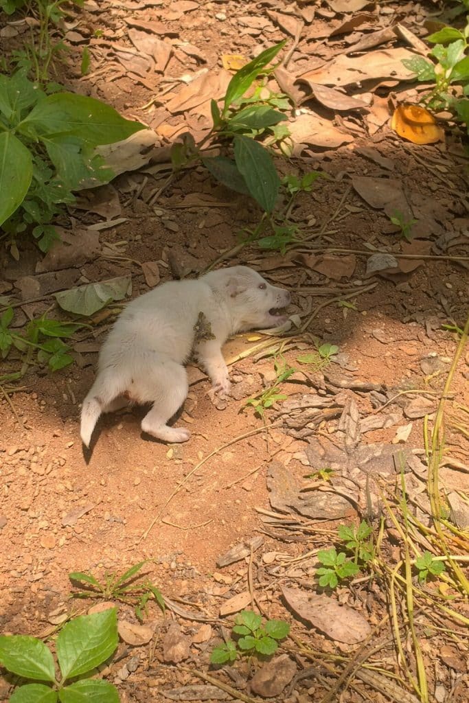 The small white puppy lay motionless on a patch of dry leaves, his body barely rising with each shallow breath. He was so fragile, so still, that it would have been easy to walk past without realizing a life was fading right there on the ground.