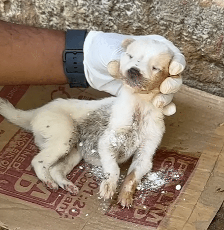 Once the parasites were removed, the man treated the puppy’s wounds. A soft layer of white powder—likely antiseptic or protective medication—was applied to the affected areas, helping to soothe the skin and prevent further harm.