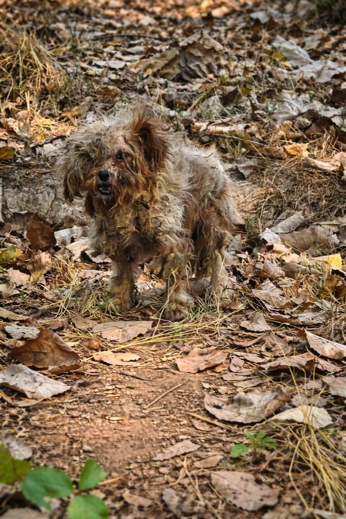 A small dog, barely more than skin and bone, lying near the edge of a quiet road. His fur was tangled and matted, heavy with dirt from days—perhaps weeks—without care. From a distance, he looked like just another stray trying to survive.