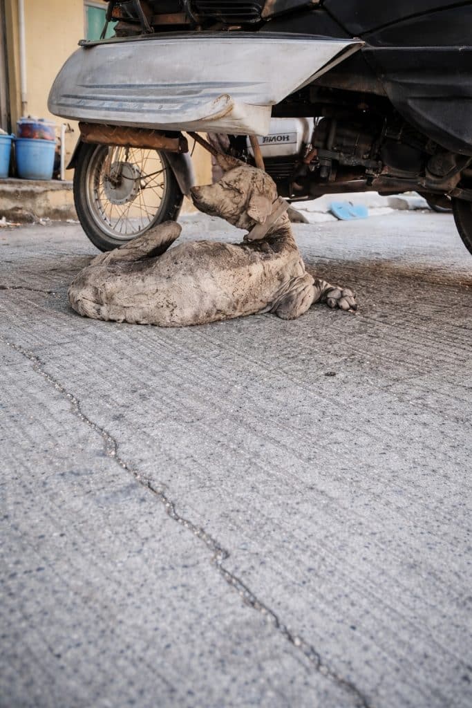 Beneath an old cart, in a quiet corner where few would look twice, a small dog curled into himself. His body told a story no one had listened to for far too long. His skin was raw and damaged, his fur almost entirely gone, leaving behind a fragile frame marked by discomfort and exhaustion.