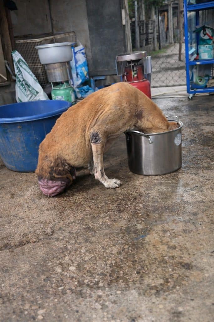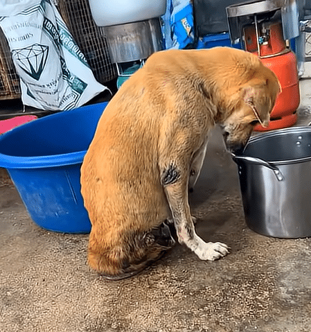 A thin, light-colored dog stood near a metal bowl, slowly lowering his head to drink. The setting was simple—somewhere that looked like a small kitchen space or a temporary shelter. There was nothing dramatic at a glance.