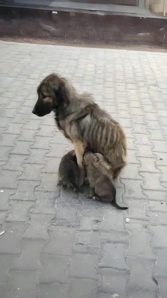 In a desolate corner of an industrial zone, where gray concrete stretched in every direction and compassion was rarely present, a mother dog was fighting a battle no one could see. Her name would later be known as Liza, but at that time, she was simply a frail figure clinging to survival. Hunger had reduced her body to skin and bones, exhaustion weighed heavily on her movements, and yet she remained alert, constantly watching over the six tiny puppies pressed close against her side.