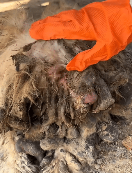 The dog’s fur was so severely matted that it had formed thick, hardened clumps, tangled with mud, debris, and whatever else had collected over time. The layers were so dense that it was nearly impossible to tell where his head ended and his body began.