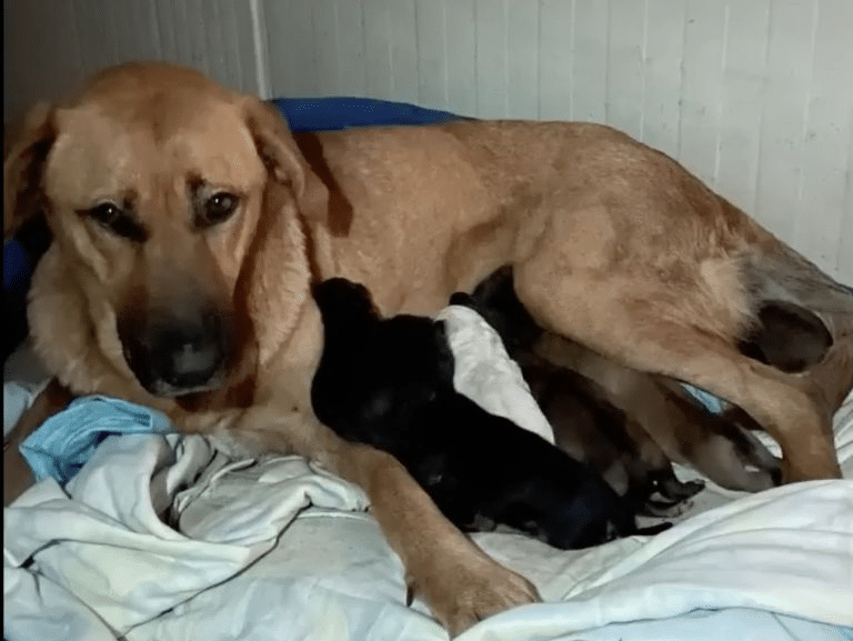 As the night wore on and the temperature continued to drop, Ingrid went into labor right there on the frozen ground. There was no warmth, no protection, no safe place to hide. One by one, her puppies were born—tiny, fragile lives entering a world that offered them nothing but cold. With only her thin body to shield them, Ingrid curled tightly around her newborns, using every ounce of heat she had left to keep them alive. Fear lingered in her eyes, but instinct guided her movements. She knew exactly what she had to do.