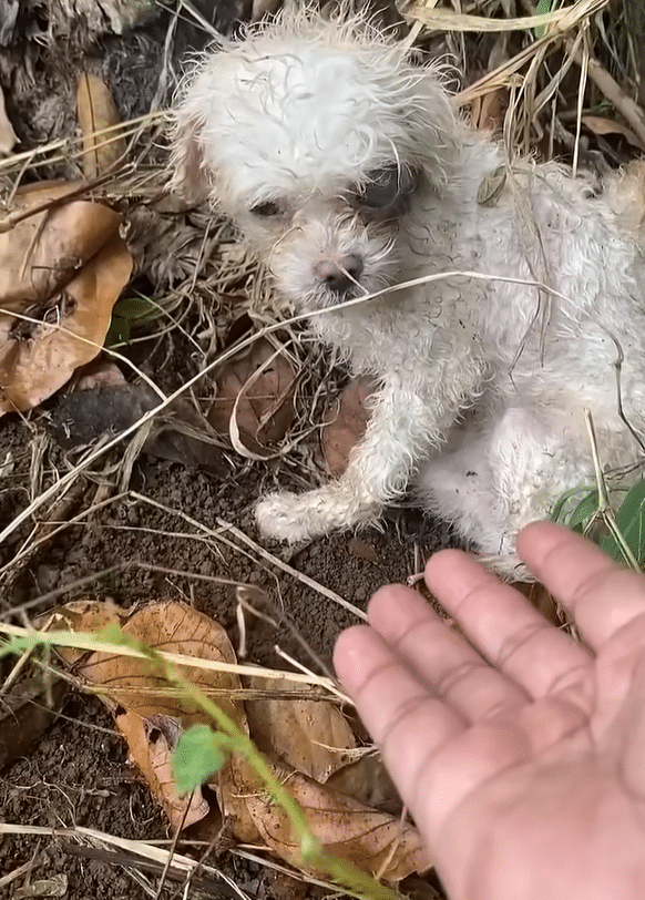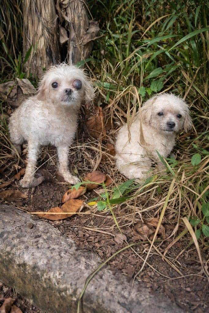 Two small white dogs, their fur once soft, now tangled and stained by time spent alone. They stayed close—almost touching—as if separating, even for a moment, felt too uncertain.
