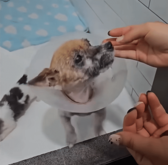 In the video, she could be seen wearing a protective collar—no longer collapsing from weakness, but standing, even asking for food.