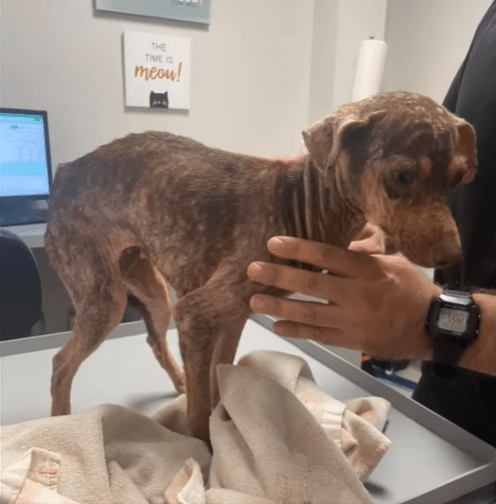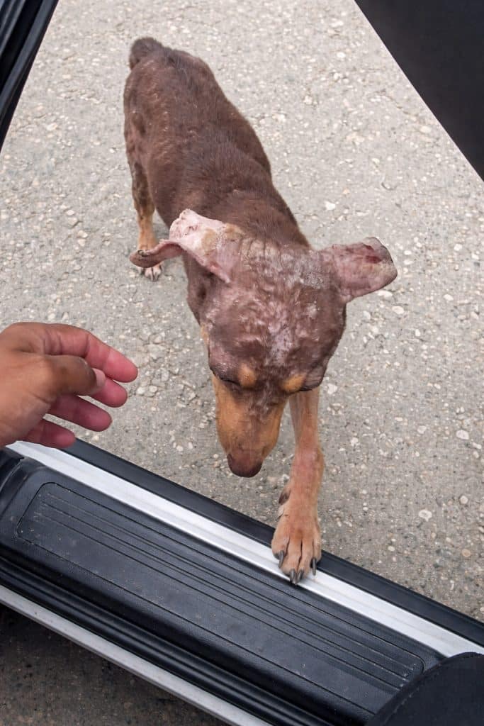 Her body, weighing only around 4.5 kilograms, showed every rib. Her skin was badly affected by mange, raw and irritated, with most of her fur already gone.