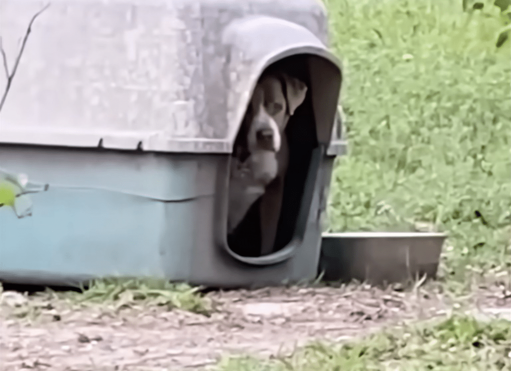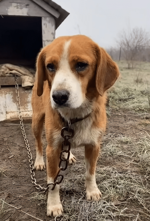 On a rural backroad, where open fields carried silence farther than sound, a single dog stood tethered beside a small, weathered structure. She wasn’t barking. She wasn’t pulling at her chain. She simply stood there, calm but tired, her posture shaped by waiting far too long.