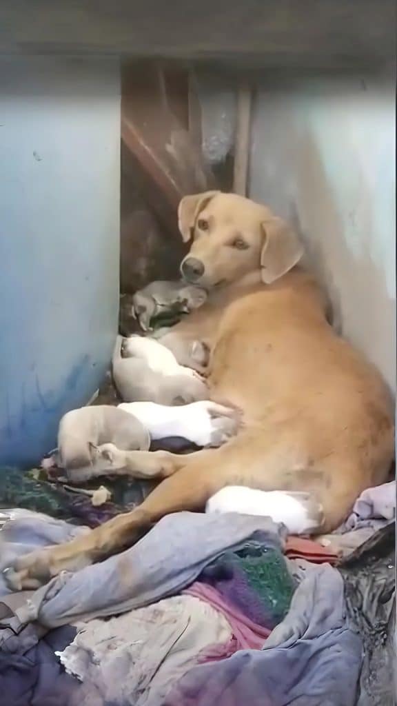 She had given birth to ten puppies. But by the time help arrived, not all of them were alive. Three tiny bodies lay motionless beside her, while several others were dangerously weak. Despite her exhaustion and illness, the mother never moved away. She nudged the puppies closer, pulled them beneath her chest, and stayed alert, as if her determination alone could keep them breathing. Even in her weakest state, her focus never shifted from her babies.
