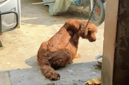 In the far corner of a dry, sun-scorched yard, Jinni lay on hard ground. A heavy chain kept her confined to a tiny patch of dirt, offering no shelter from the heat and no escape from discomfort. Nearby, a forgotten bowl held murky water, untouched—as if even drinking required more strength than she had left.