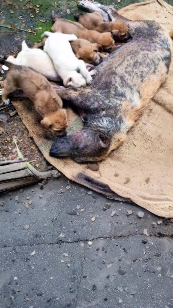On the outskirts of a small town, where unwanted trash gathered in quiet piles and few people ever slowed down, a mother dog lay completely exhausted. Her body was thin and drained, her breathing shallow after days of pushing herself beyond her limits. Yet pressed tightly against her side were the tiny lives that mattered more to her than her own pain. Curled close for warmth, her puppies slept peacefully, unaware of how close they were to danger. In that forgotten place, she held on not because she still had strength, but because motherhood demanded it.