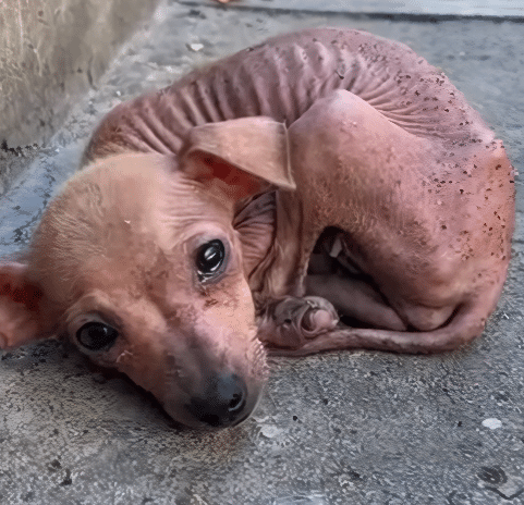 Dobby’s appearance told his story before he ever made a sound. Nearly all of his fur was gone, leaving his skin exposed and irritated. His ears were rough and inflamed, and his body trembled almost constantly. Each step he took looked uncertain, as though his legs could give out at any moment. Hunger had weakened him, and exhaustion clung to every movement. This was not a dog who had been lost for a day or two. This was a dog who had been surviving on borrowed time.