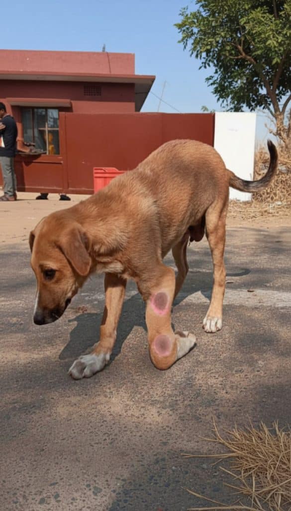 What stood out immediately was Jadu’s demeanor. Despite the severity of his injuries, he showed no aggression and no panic. When people approached cautiously, expecting fear or resistance, Jadu responded with something entirely different. His tail moved gently, almost apologetically, and his eyes reflected trust rather than terror. It was as if he sensed that help had finally arrived and chose to believe in it.