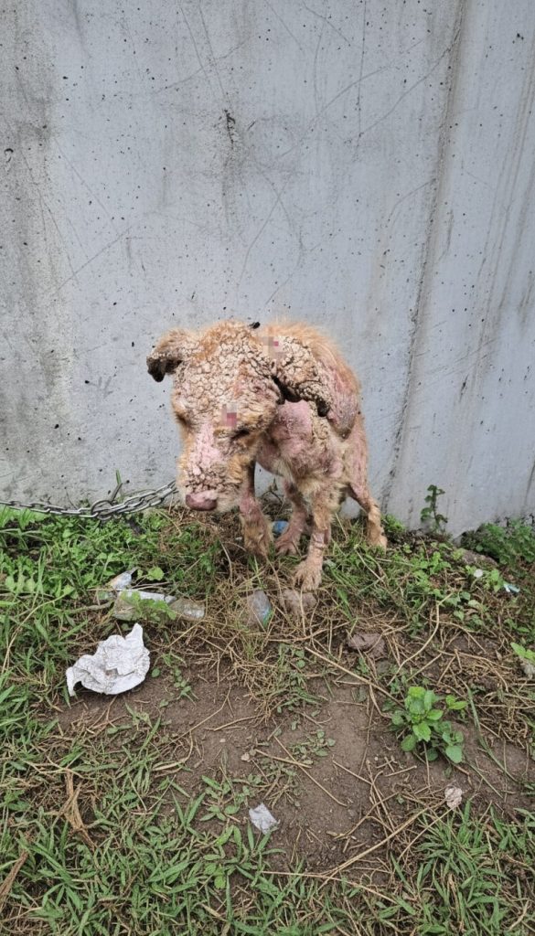 As seasons changed, the toll of neglect became impossible to hide. A severe skin condition spread across her body, leaving her constantly uncomfortable and weak. Her fur thinned until large patches of bare skin appeared, irritated and sore. Hunger hollowed out her small frame, and the strength she should have had as a young dog never fully arrived. Still, no one intervened. The person responsible chose distance over care, silence over responsibility.