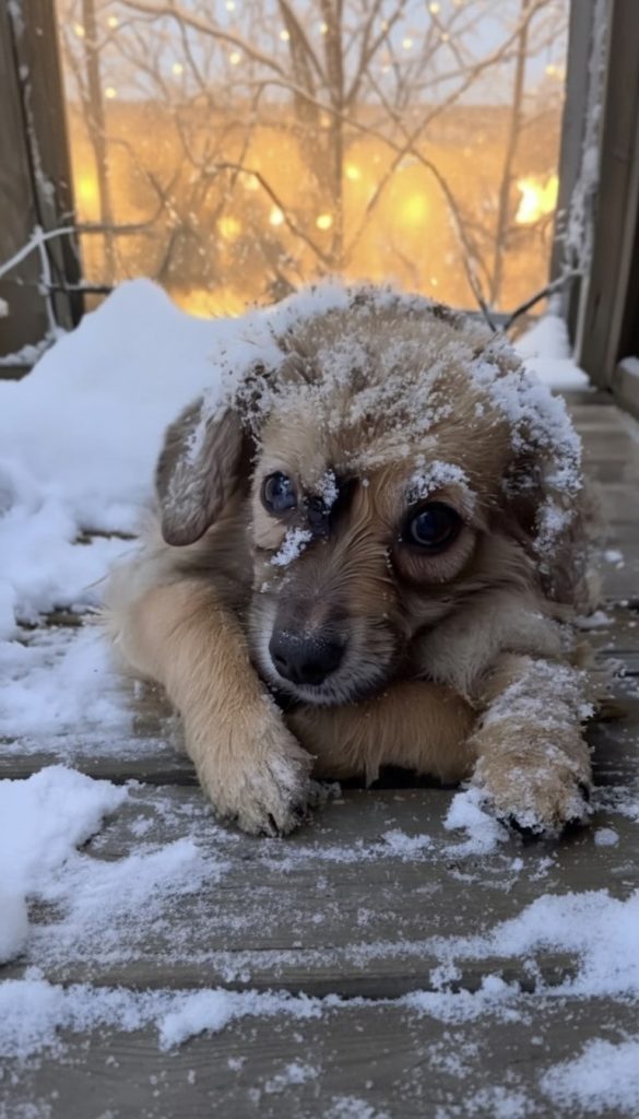 On a night when winter showed no mercy, a tiny tan puppy pressed himself into the corner of a frozen porch, trying to disappear into the cold. The wind howled through his thin, matted fur, and snow crept closer with every passing hour. He wasn’t waiting to be saved. He was simply doing everything his small body could to survive until morning. His legs shook without pause, and his wide, exhausted eyes reflected a life that had known hunger, fear, and far too many nights without warmth.
