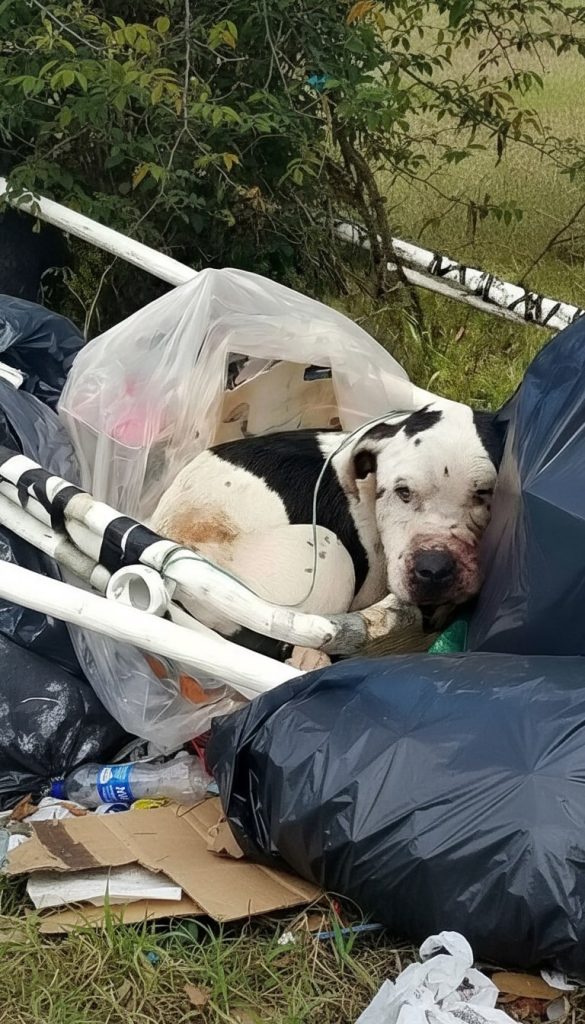 The moment unfolded quietly, without drama or warning, along a stretch of roadside most people never truly notice. It was the kind of place where discarded plastic bags clung to weeds, where torn packaging and scraps of white debris layered the ground like a second skin. Among that mess, barely distinguishable at first glance, lay a small white dog marked with black patches. He was curled tightly into himself, pressed against damp refuse as if trying to disappear into it, searching for even the faintest hint of warmth in a place that offered none.