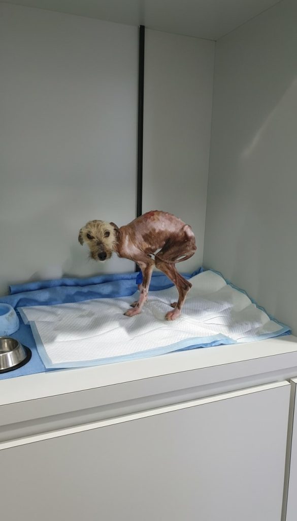 Wrapped in warm blankets, Ivy lay quietly during the drive to the veterinary clinic. She didn’t resist. She didn’t cry. Gentle voices filled the van, offering comfort she may never have known before. At the clinic, the full reality of her condition became clear. Beneath the matted fur was a body ravaged by starvation. Every rib was visible. Her spine stood out sharply. Her legs were weak, her strength nearly gone.