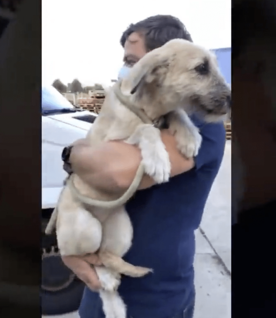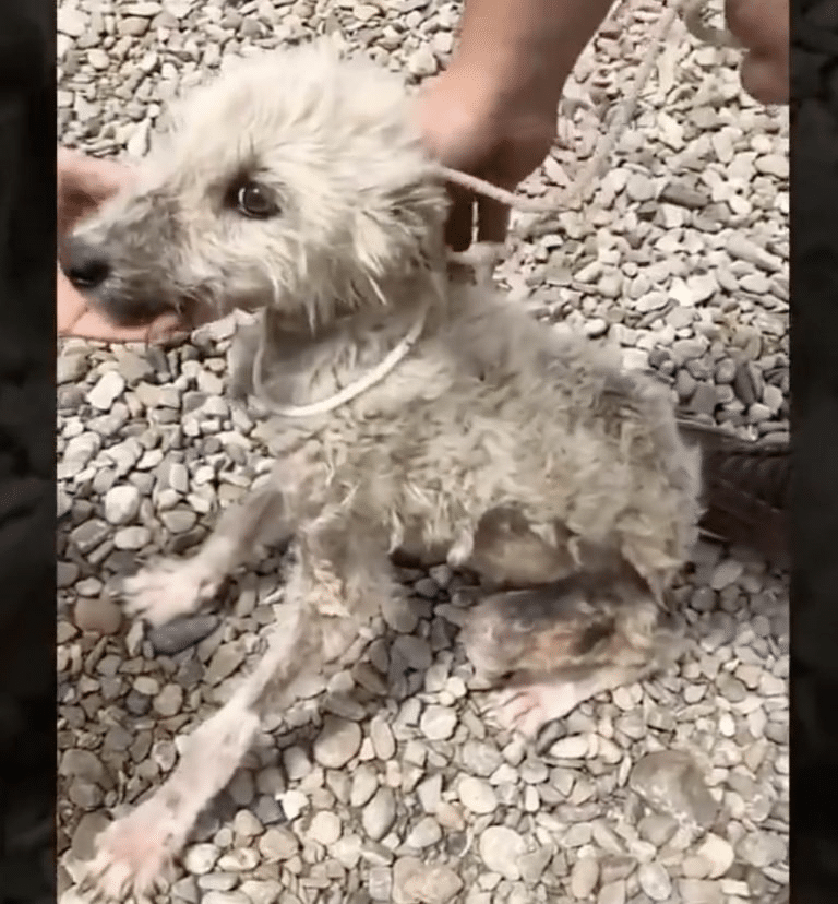Up close, the sight was heartbreaking. Her fur was tangled and dirty, clinging to a frame that was far too small for her age. Around her neck was a worn piece of rope—silent evidence that her past had offered little care or kindness. The rescuers spoke softly, careful with every movement. They didn’t rush her. They waited.