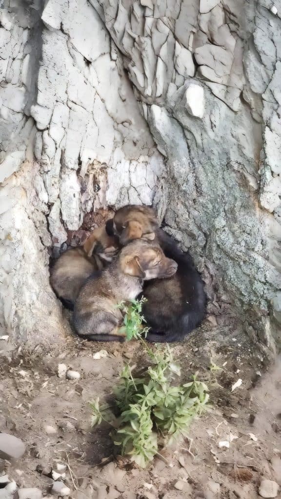 On a calm afternoon, beneath the wide branches of an old oak tree, three tiny puppies lay pressed tightly together in the grass. Their bodies were small and fragile, their cries soft but filled with confusion. They were far too young to understand why they were alone, or why their mother never returned.