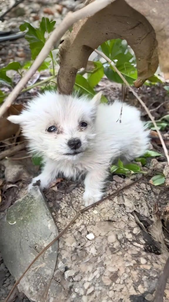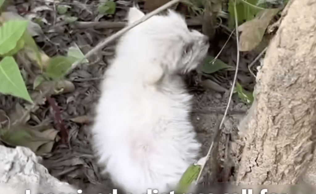 By the time the rescuer arrived, the trail felt painfully still. At the base of a rough-barked tree, a tiny puppy lay curled into himself, as if trying to disappear into the earth. His body trembled from cold and hunger. Each breath was shallow. He was so thin he nearly blended into the shadows.