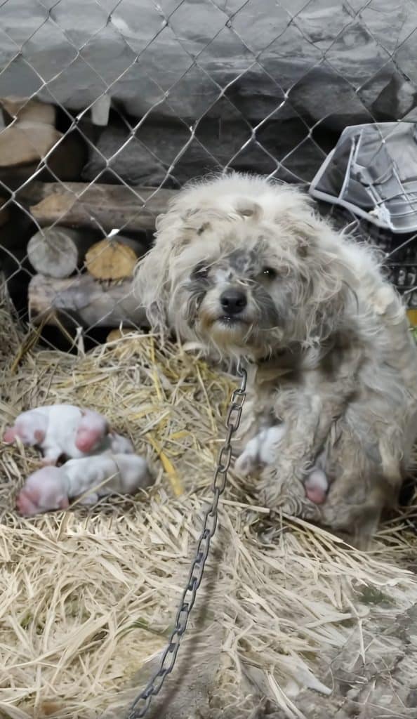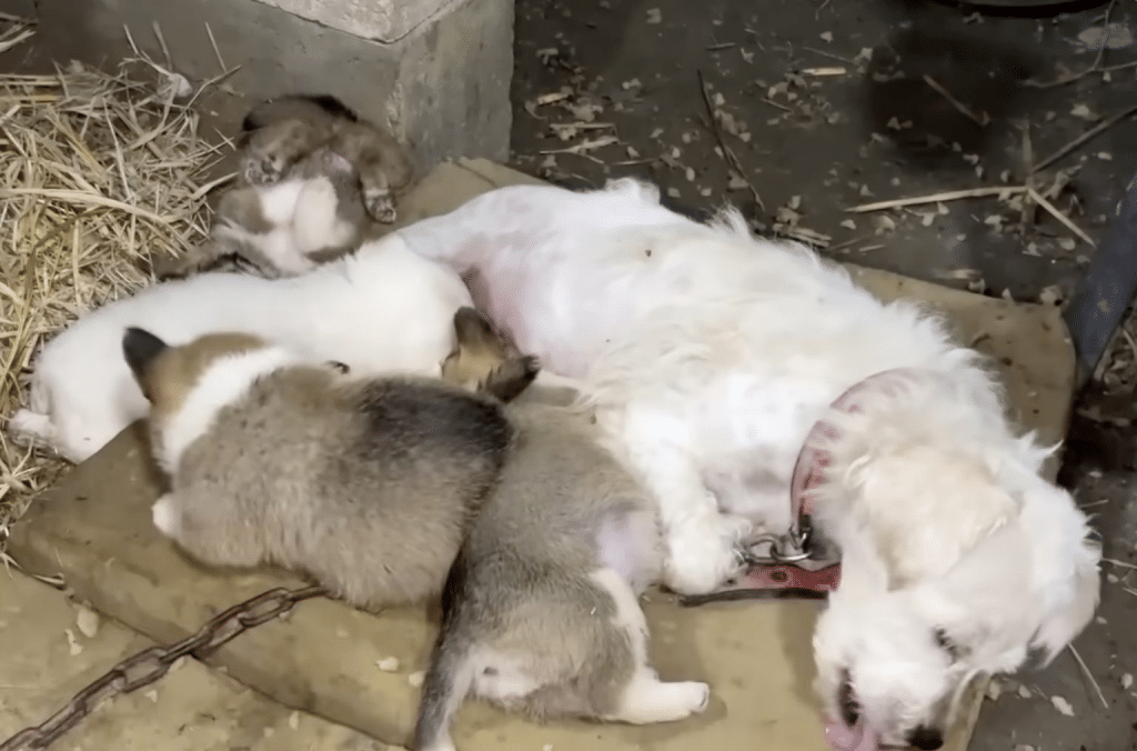 VIDEO: Chained, The Mother Dog Holds Her Newborn Puppies And Cries When There’s No Milk To Feed Them