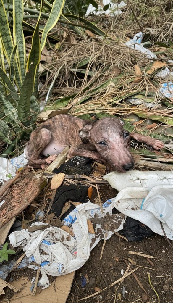 Gorgojita entered the world quietly, without warmth or protection. Her first moments were marked by hunger, confusion, and loss—circumstances no living being should ever face. She was found beside a roadside, surrounded by discarded trash, her tiny body pressed close to the still form of her mother, who had lost her life in a tragic accident. For a puppy barely old enough to open her eyes, the absence of care was devastating. She cried softly, weak and disoriented, unaware that her story was only just beginning.
