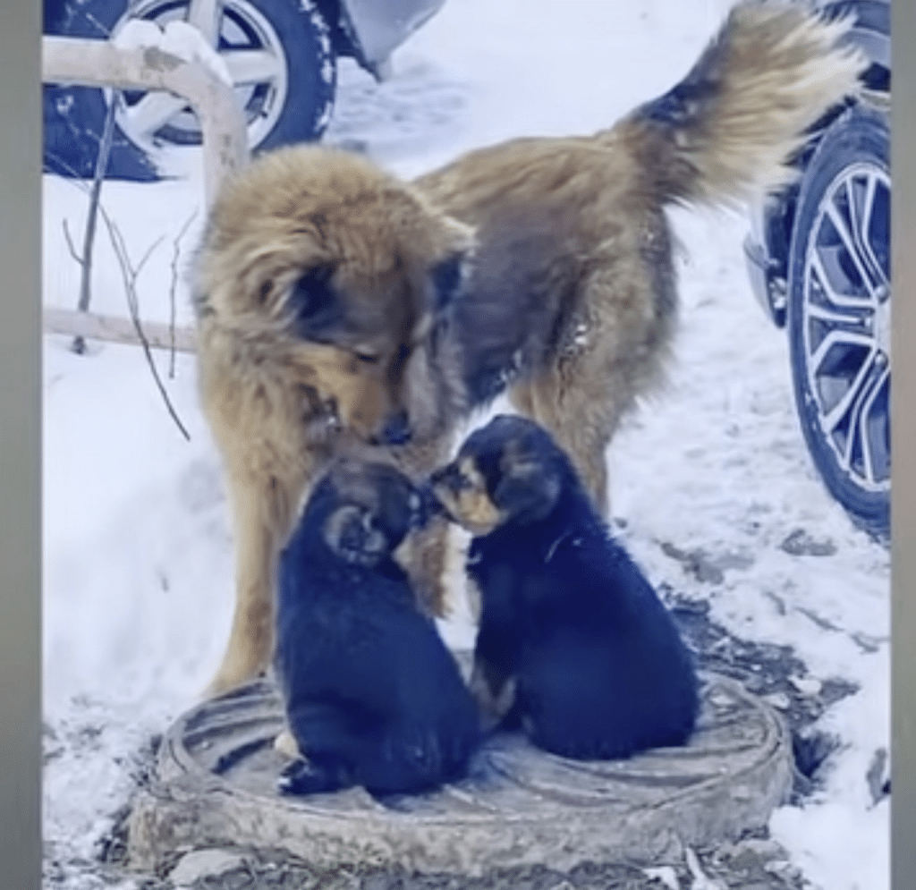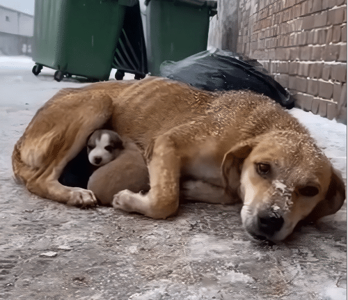 Curled tightly against the frozen ground lay a mother dog. Frost clung to her fur, and her body trembled from exhaustion and cold. With what little warmth she had left, she wrapped herself around two tiny puppies pressed against her belly.