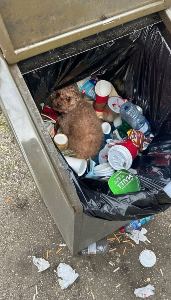 Hidden beneath the trash was a small brown dog, curled in on himself as if trying to disappear. He wasn’t barking. He wasn’t struggling. He was simply lying there, silent and exhausted, like a creature that had given up on being noticed. The realization hit hard: this wasn’t a stray wandering freely. This was a dog who had been deliberately thrown away.