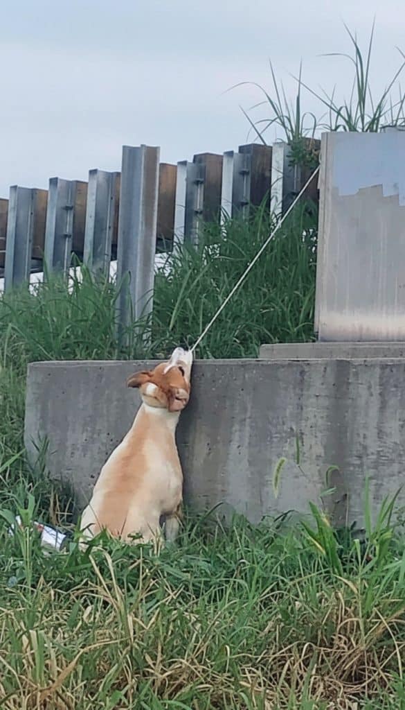 Near an electrical box by the overpass, a dog was suspended in a terrifying position. A cord was tightly wrapped around the dog’s neck, leaving him barely able to keep his paws on the ground. His body was tense, movements weak and frantic. Each breath was a struggle. This was not a situation that allowed hesitation.