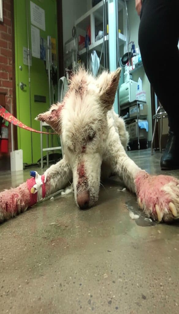 They took in the heartbreaking sight of a dog worn down by hunger and exhaustion.