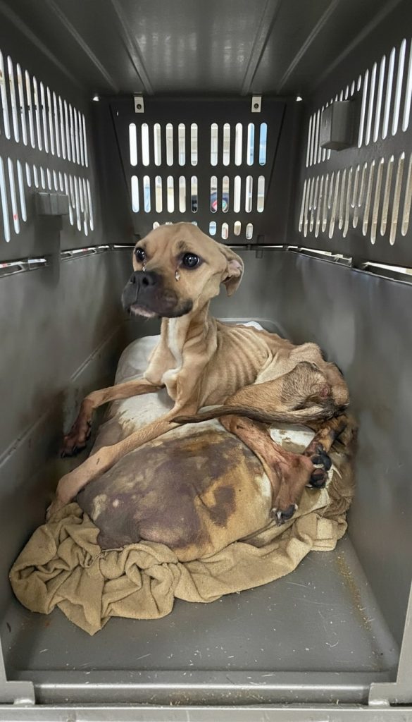 When rescuers arrived, the reality of her condition was impossible to ignore. Her body was dangerously thin. Her movements were slow and careful, conserving what little strength remained. Her coat was dull and tangled, and her eyes—tired and guarded—still searched the faces around her.