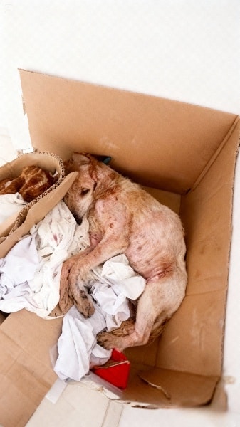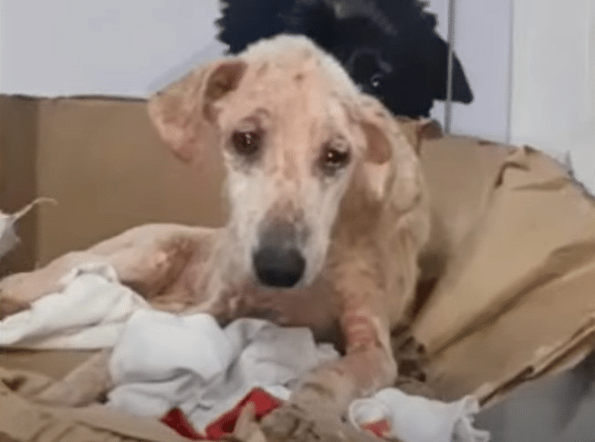 His condition told a painful story. His body was soaked, filthy, and dangerously thin. A dirty shirt had been wrapped around him—not to keep him warm, but to hide him. His skin was inflamed and irritated, showing clear signs of long-term neglect and exposure. Hunger had taken a visible toll, leaving him weak and depleted. Yet despite everything, his eyes followed every movement closely. He was exhausted, but aware. And in that awareness was a quiet plea for help.