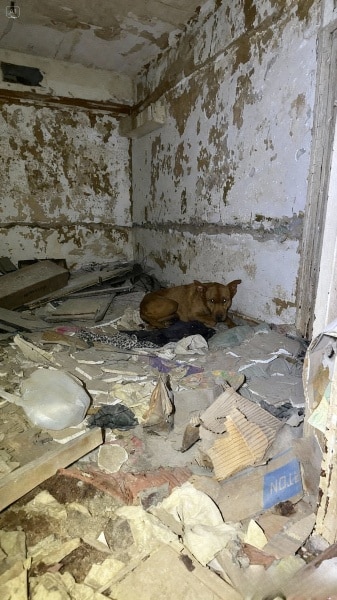 Inside one of the damaged apartments, they found her curled tightly in a corner, trembling from head to tail. She wasn’t running anymore. Fear had frozen her in place. It was a moment that called for empathy rather than force.