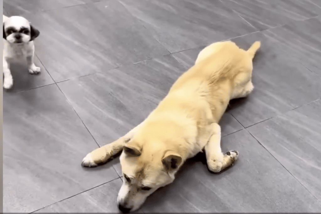 On a quiet winter morning, when the cold clung tightly to the ground, a man stepped outside his home and noticed a dog lying motionless near an old fence. At first, it looked as though the animal was resting. But as he moved closer, the truth became impossible to ignore. The dog’s body was stiff, painfully thin, and cold to the touch. There was no reaction, no strength left to lift his head. His eyes, clouded and distant, carried the weight of years spent suffering in silence.