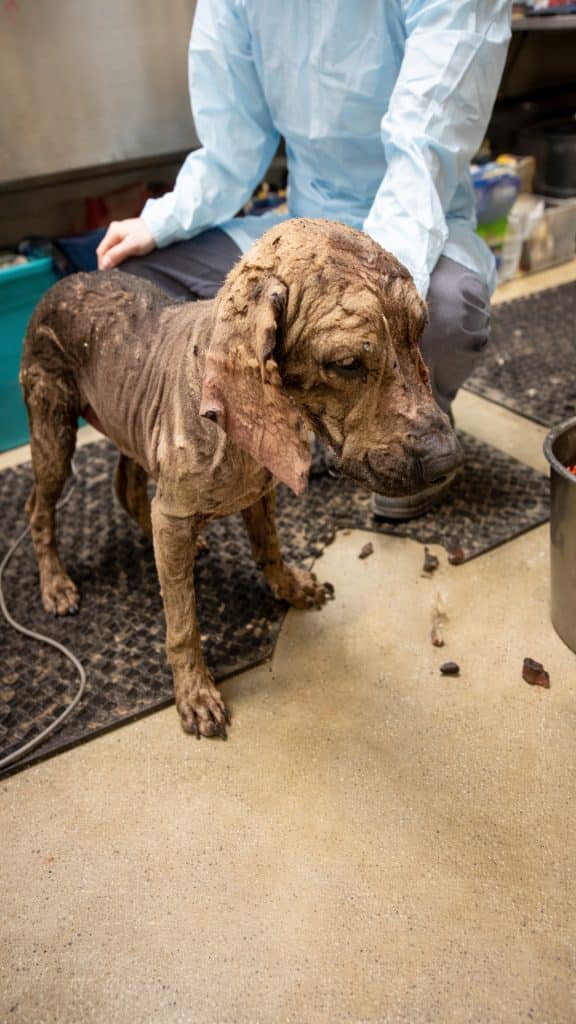 A veterinary examination confirmed what rescuers already feared: advanced skin disease, infection, and severe weakness caused by prolonged neglect. This would not be a quick recovery.