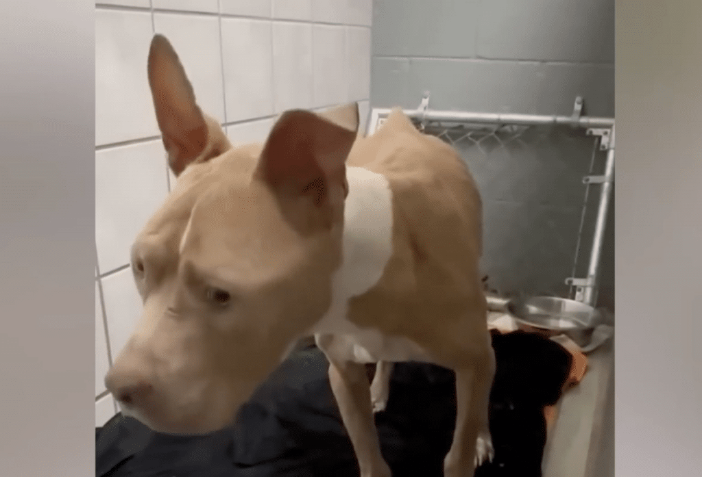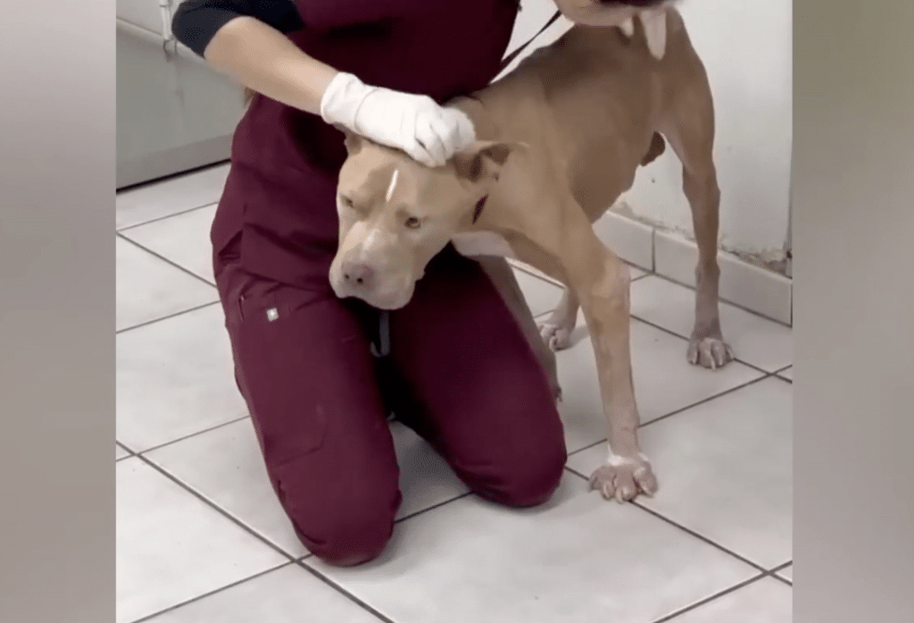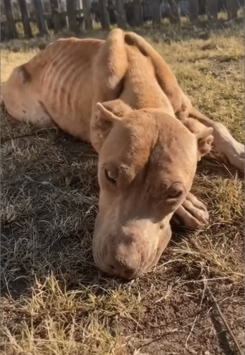 Behind a small, overgrown house in Highland, California, a pit bull named Gator was quietly fading away. When rescuers finally saw him, his body told a painful story. He was dangerously thin, his ribs and spine sharply defined beneath dull, fragile fur. His legs shook as he tried to stand, weakened by hunger and neglect. Yet when he lifted his head, his eyes revealed something unexpected — exhaustion mixed with a quiet determination that refused to disappear.
