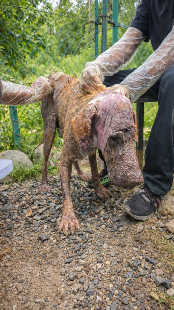 Beyond the visible wounds, the dog was suffering from external parasites that caused relentless itching and irritation. Rest had likely been impossible for weeks, if not months.