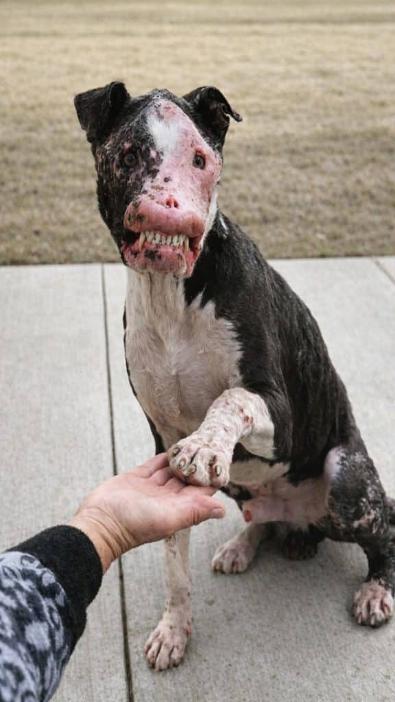 When Phoenix was first seen roaming the streets of Collinsville, Oklahoma, he blended into the background the way so many strays do—quietly, cautiously, and unnoticed by most. His body was thin from weeks or months of uncertainty, his movements slow and deliberate, as if every step required careful thought. But it was his face that stopped people in their tracks. Severe skin damage had altered his appearance so dramatically that passersby couldn’t help but stare, some with concern, others with confusion. Few could have guessed then just how extraordinary his journey would become.