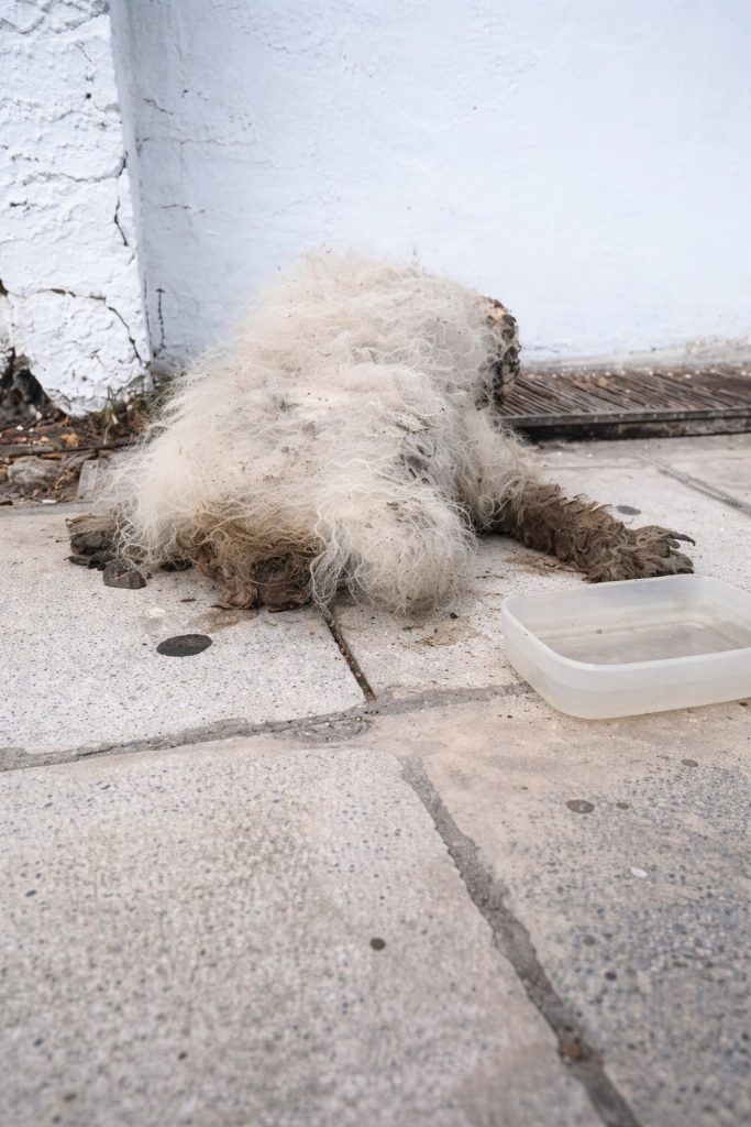 When Valya, a volunteer with a small animal welfare group, received a short message asking for help, she braced herself for another difficult scene. Experience had taught her that these calls rarely came without heartbreak. Still, nothing prepared her for what she saw on the sidewalk that day. Lying motionless against the pavement was what looked less like a dog and more like a pile of dirt and debris. Thick, hardened fur was caked with grime, blending almost seamlessly into the ground beneath him.